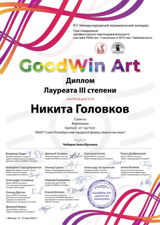 В мае дистанционно прошел XII Международный музыкальный конкурс при поддержке профессорско-преподавательского состава РАМ им. Гнесиных и МГК им. П.И. Чайковского GoodWin Art.