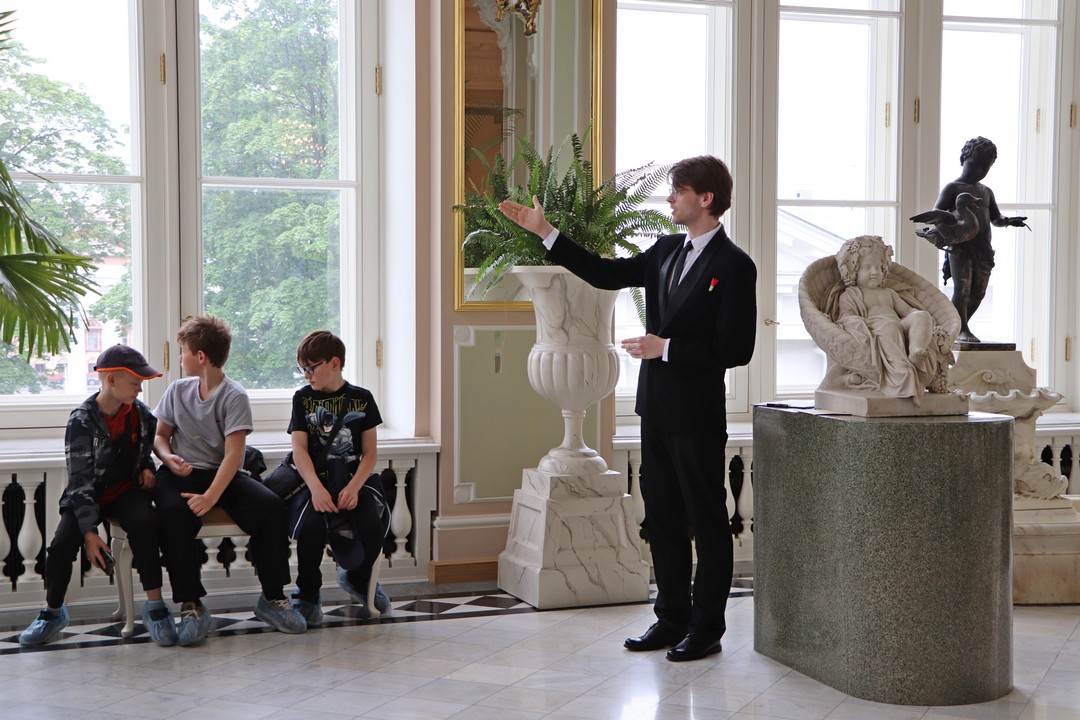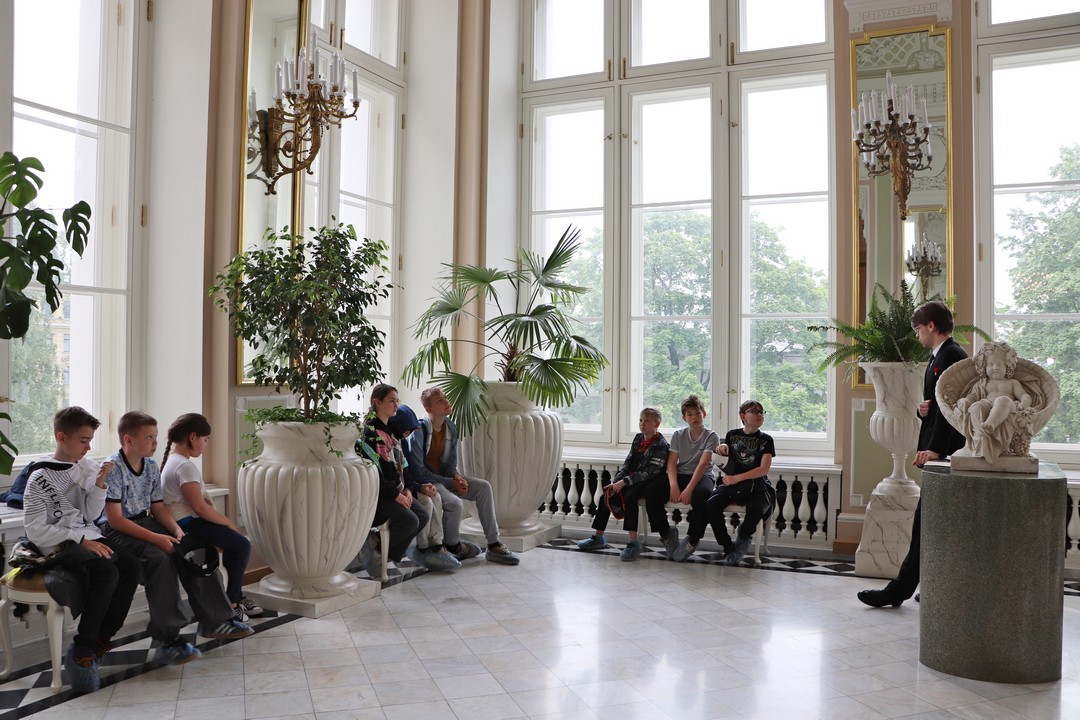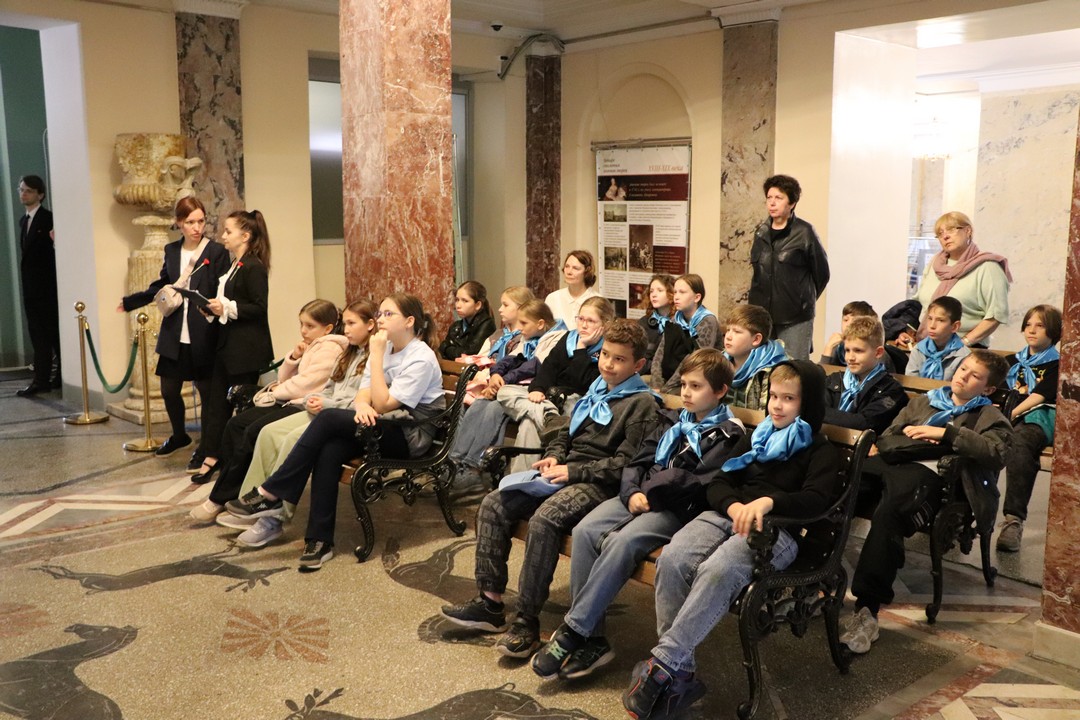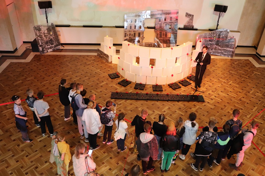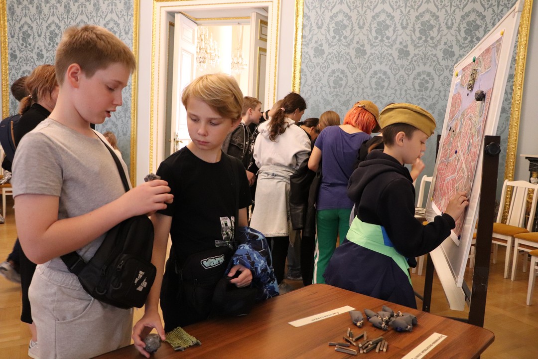 Продолжилось мероприятие на территории Аничковой усадьбы, где современные школьники прикоснулись к страницам истории. Так, ребята посмотрели фрагмент фильма «Мы смерти смотрели в лицо», услышали рассказ о создании знаменитого Детского танцевального Ансамбля им. А.Е. Обранта и о его деятельности во время Великой Отечественной войны. С напряжённым вниманием участники слушали воспоминания детей Ленинграда о первых днях войны и исторические сведения о том, как, несмотря на ужас блокадных испытаний, город жил и боролся. Перед лицом общей опасности люди объединялись, демонстрируя необычайную силу духа и любовь к Родине.