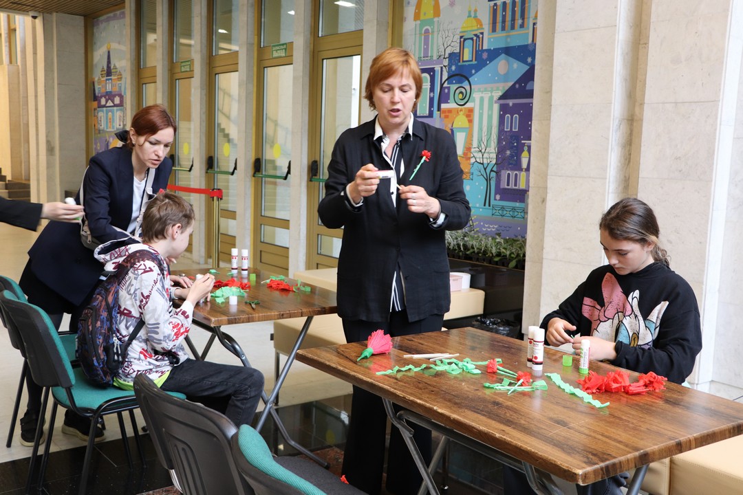 Также учащиеся исследовали карту Петербурга, находя объекты городской архитектуры, скрытые и замаскированные в военное время. Завершилась акция созданием самодельных бумажных гвоздик, которые юные участники возложили на импровизированный монумент «Вечного огня».