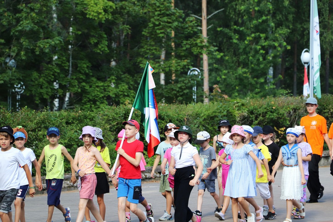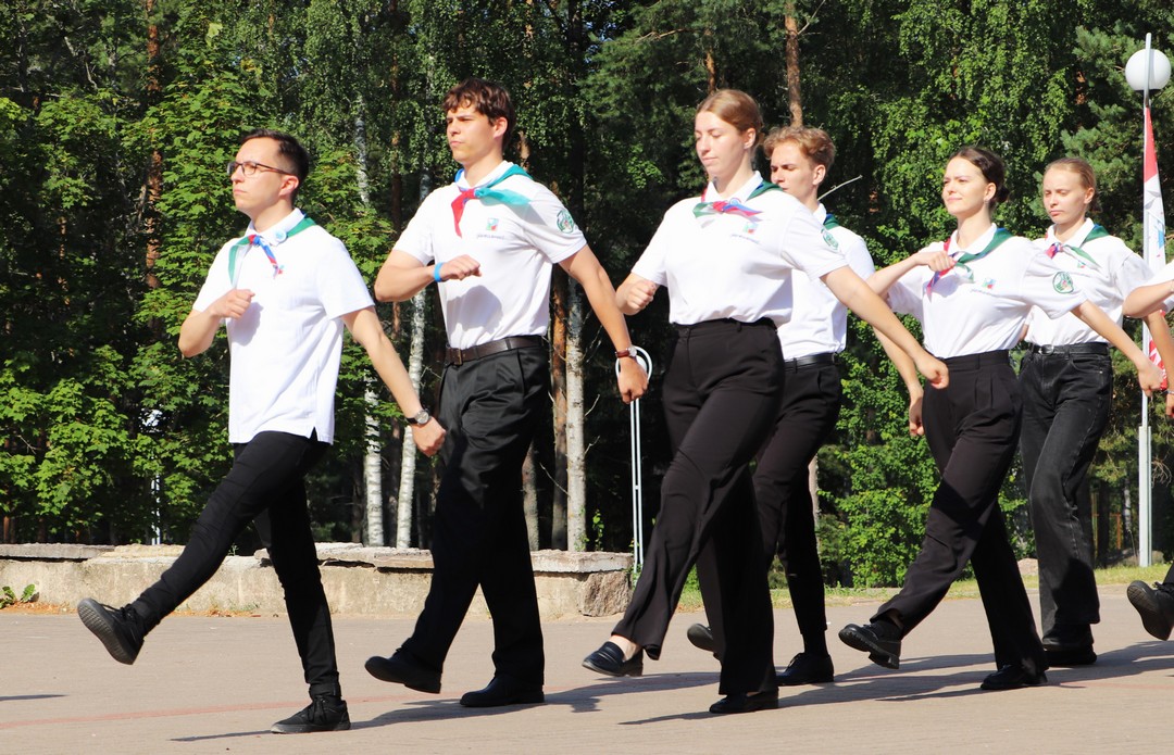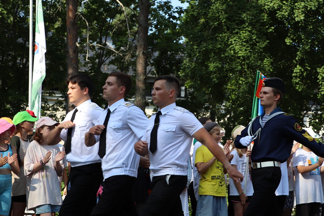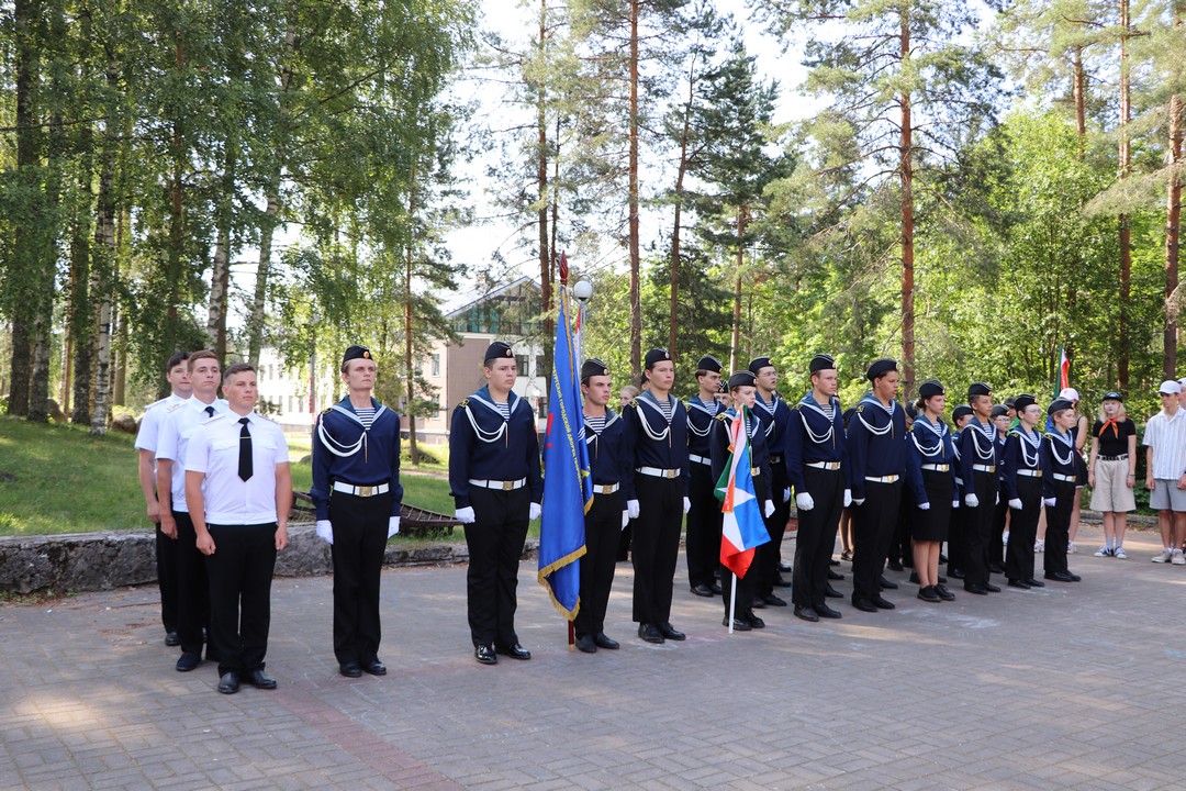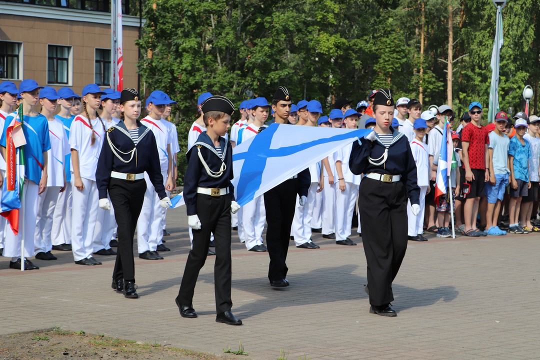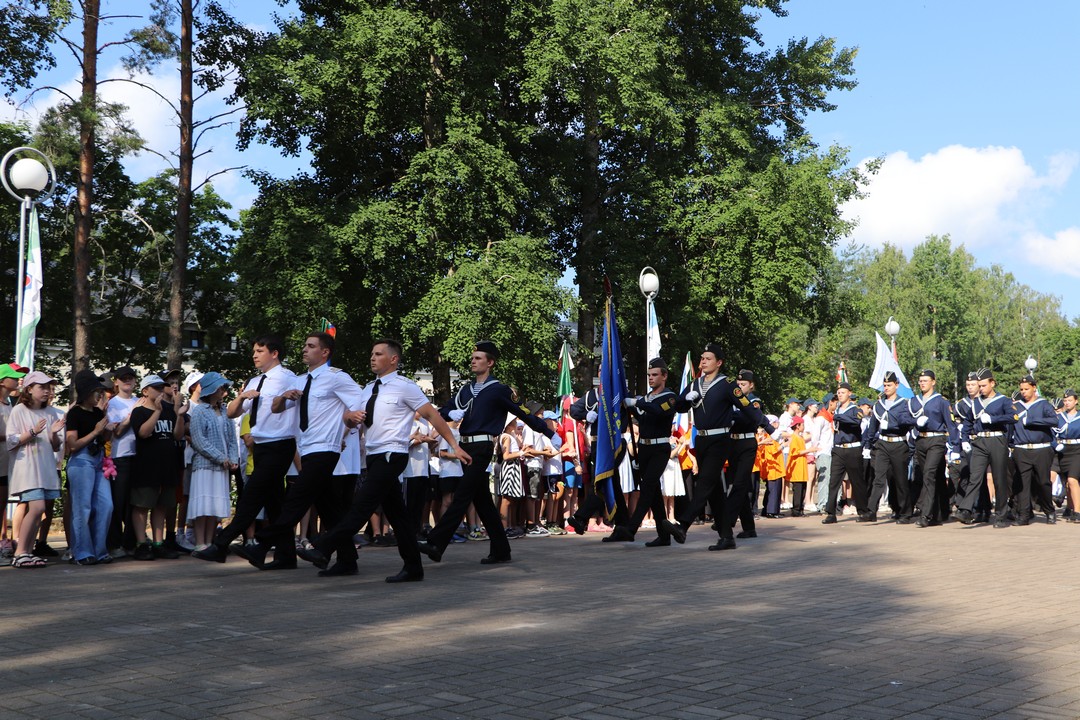 Утро началось с торжественной линейки: все отряды прошли парадным маршем и выстроились на площади. По сложившейся традиции, экипаж Морского клуба «Юнга» вышел последним под знаменем Клуба.