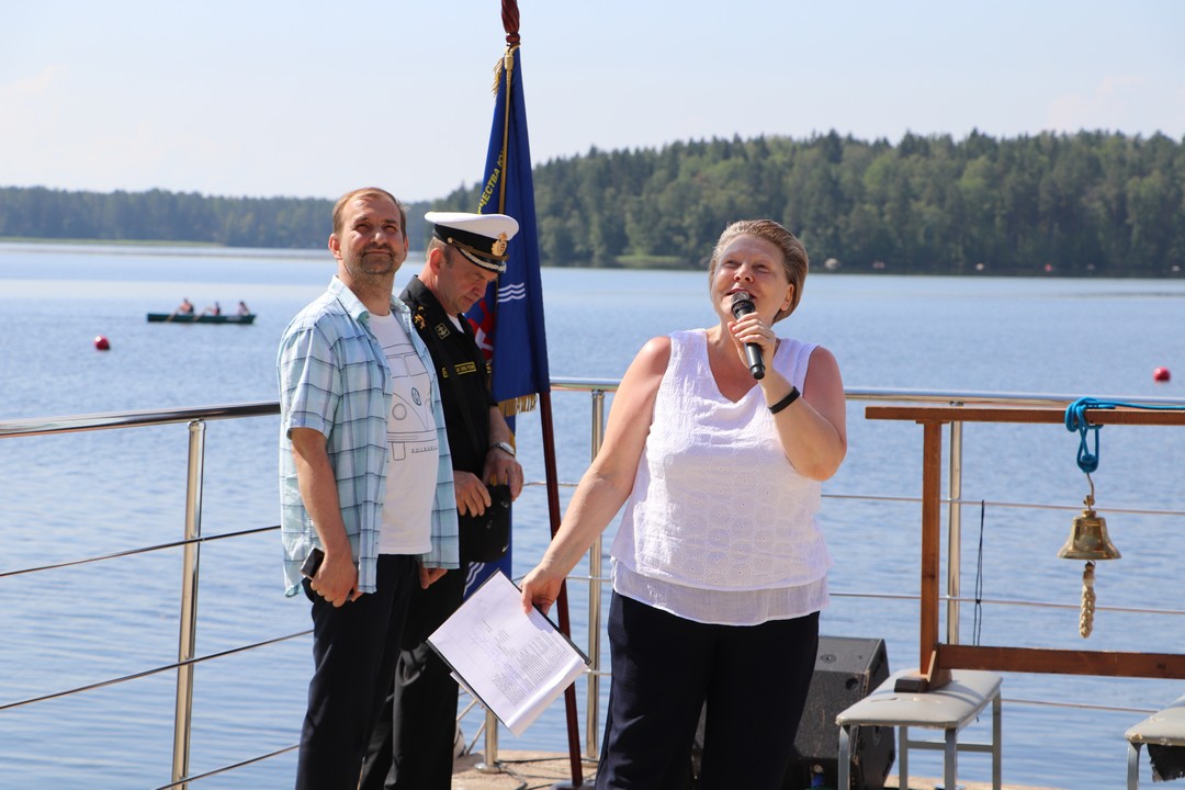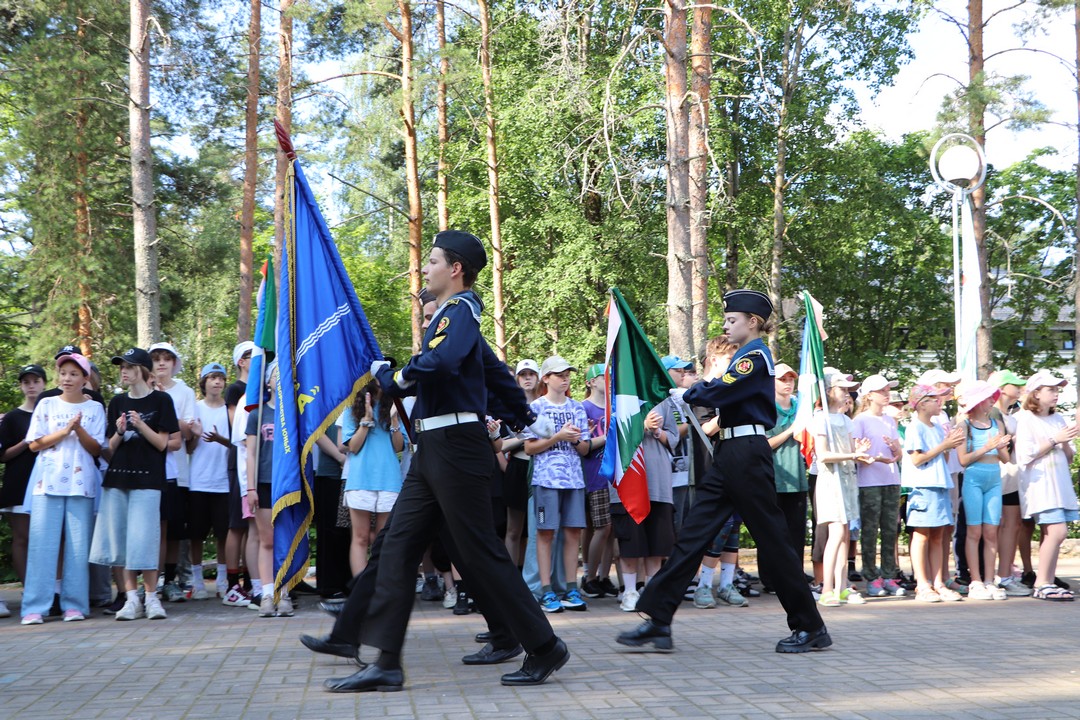 Лучшим юнгам шлюпочной практики была поручена почетная миссия – внести символ Военно-Морского Флота Российской Федерации – Андреевский флаг: Генрику Нагапетяну, Анне Германович, Катарине Костиной, Ивану Федорову, а право поднять стяг было предоставлено отличникам морской и физической подготовки 3-ей летней смены: старшине экипажа Луке Евсееву, старшине 4 отделения Федору Шульге, Таисии Кугуеловой, Тамерлану Бадрихафизову, а также почетному гостю – Андрею Олеговичу Леонову!