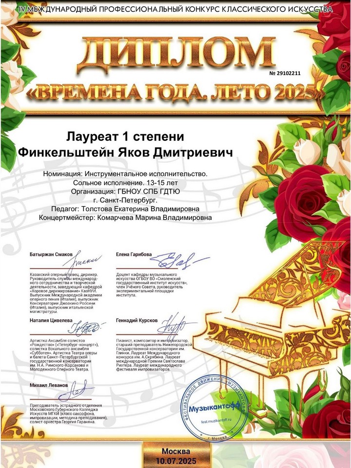 В номинации «Инструментальное исполнительство. Сольное исполнение», Яков завоевал Диплом Лауреата 1 степени!