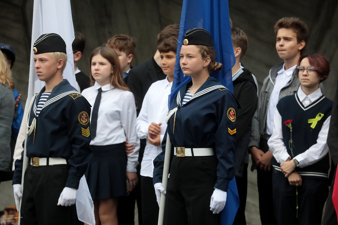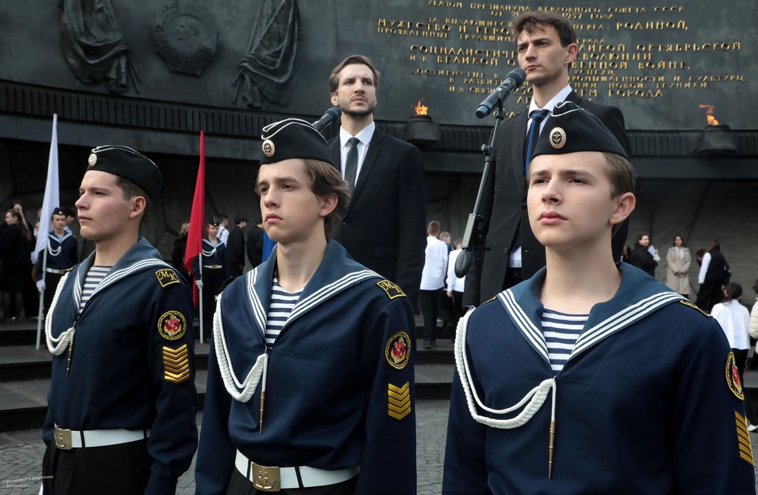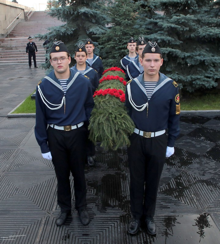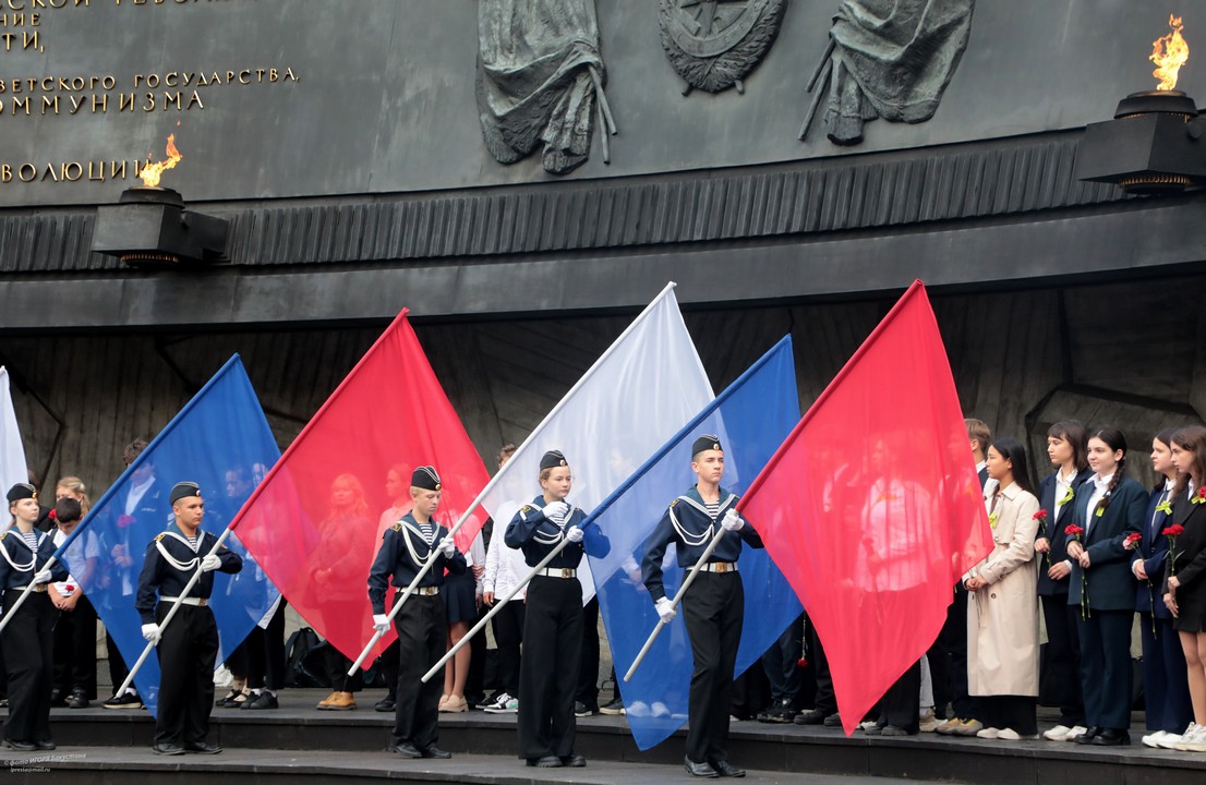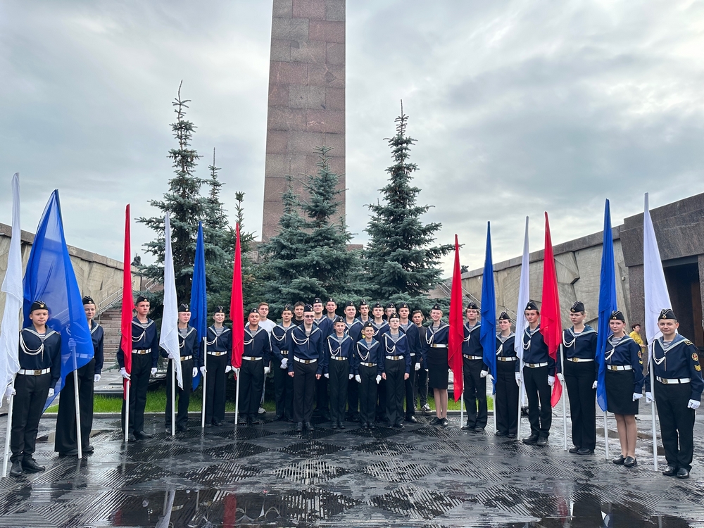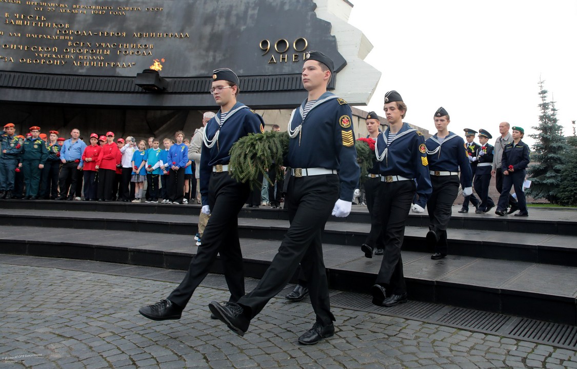 По традиции обучающиеся Морского клуба «Юнга» стояли в почетном карауле, держа полотнище в цветах ленточки Ленинградской Победы и Российский триколор, а затем возложили памятную гирлянду к Мемориалу.