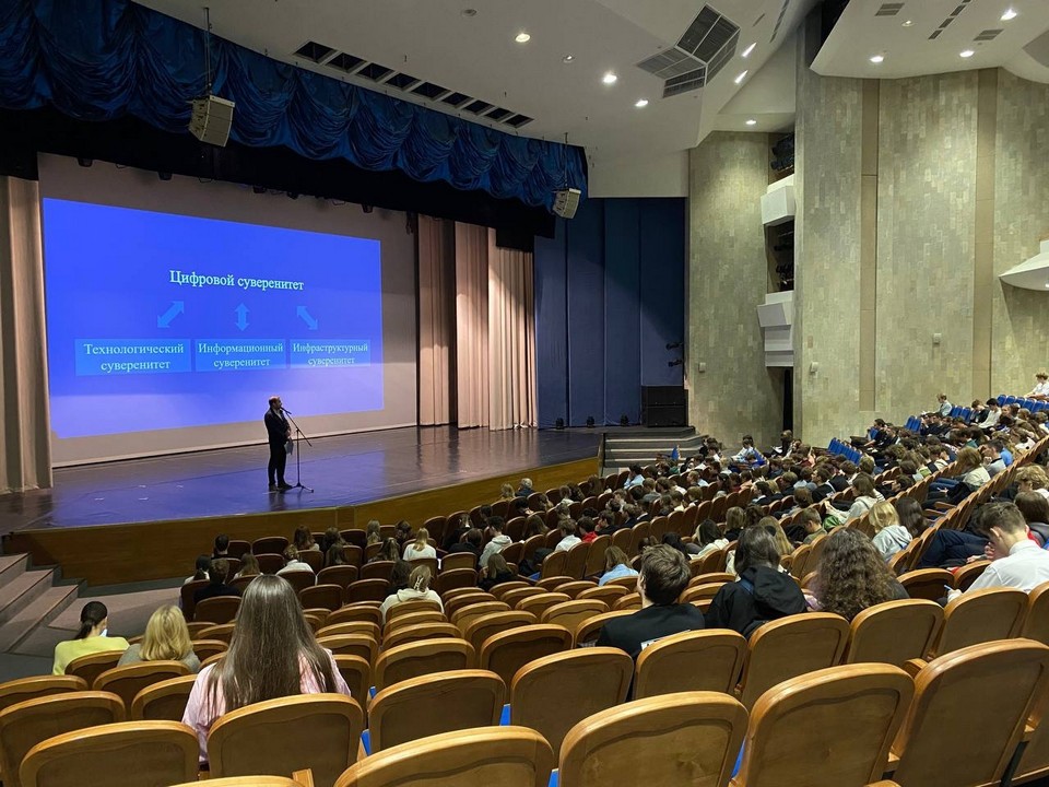Перед лицеистами выступил Иван Михайлович Колосов, заведующий Отделом техники Дворца и учитель информатики лицея. Он рассказал о том, что такое цифровой суверенитет, почему он важен для национальной безопасности, экономики и технологической независимости России, а также как каждый гражданин – особенно молодёжь – может внести свой вклад в развитие отечественных цифровых решений.