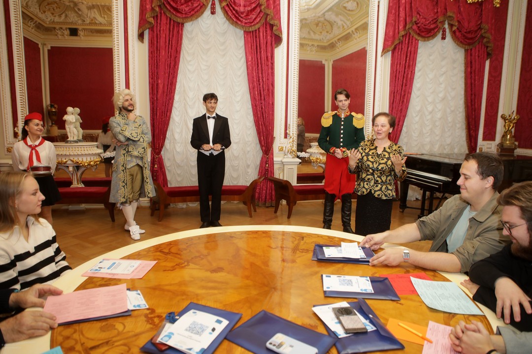 На станции «Я – Дворцовец» педагоги-организаторы Театрально-концертного комплекса «Карнавал» Николай Лелюк, Никита Француков, Лев Богачев и Дарья Парфенова в театрализованной форме познакомили молодых педагогов с историей Аничкова дворца. Участники отвечали на вопросы викторины, выполняли командные задания, которые проводятся для воспитанников Дворца в рамках программы «Я – Дворцовец».