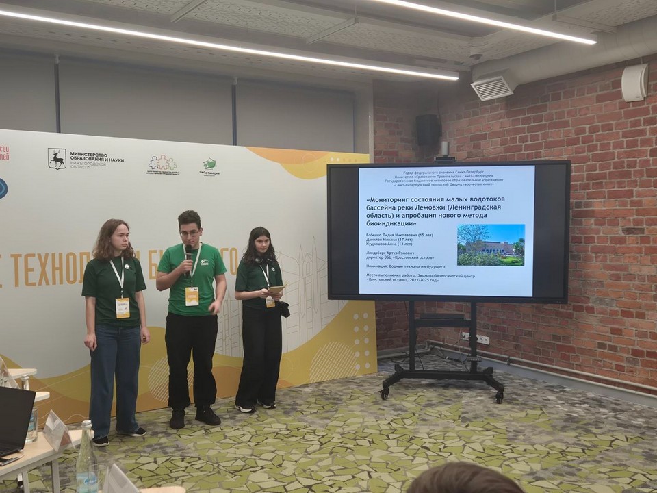 От Санкт-Петербурга выступила команда из трёх воспитанников Эколого-биологического центра «Крестовский остров»: Лидия Бабенко, Михаил Данилов и Анна Кудряшова. Они представили конкурсную работу «Мониторинг состояния малых водотоков бассейна реки Лемовжи (Ленинградская область) и апробация нового метода биоиндикации» под руководством Артура Рэмовича Ляндзберга.