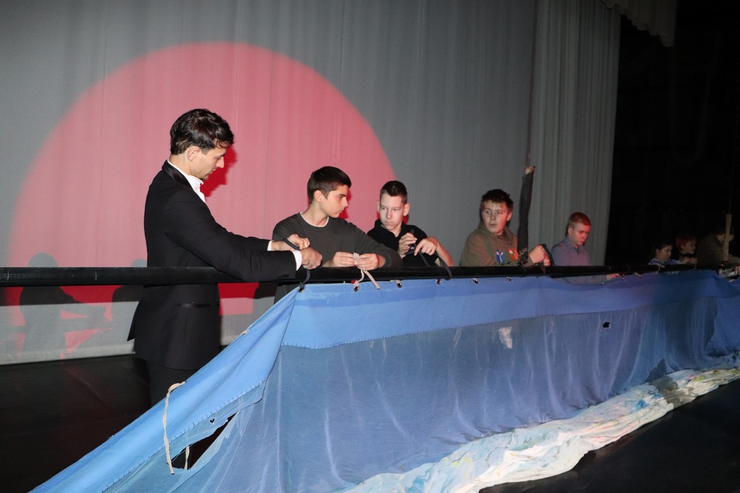 Самое интересное ждало гостей на сцене: участникам предстояло закрепить мягкие декорации на штанкет, опустить «горизонт» и выставить жесткие декорации.