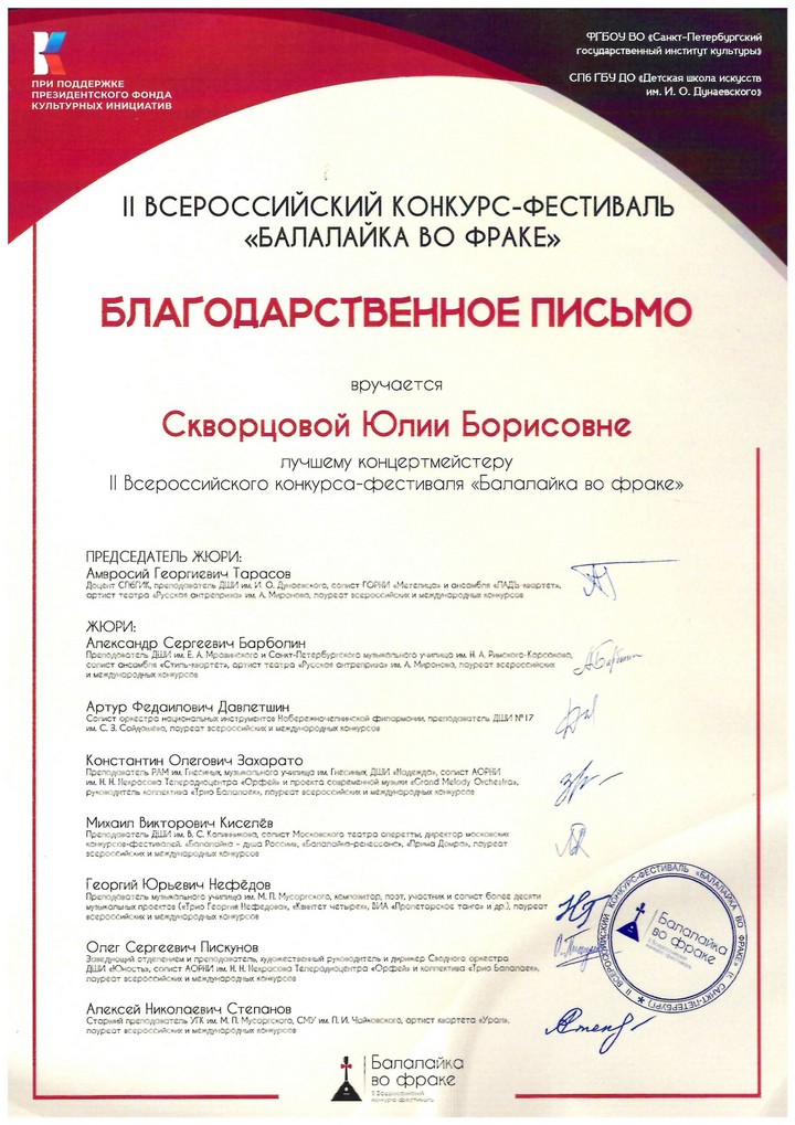 С 25 по 31 октября в Санкт-Петербургской детской школе искусств им. И.О. Дунаевского состоялся II Всероссийский конкурс-фестиваль «Балалайка во фраке».