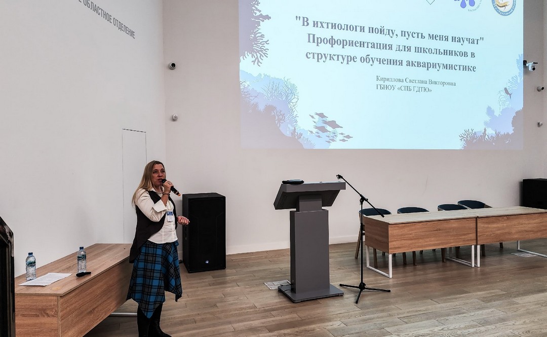 На конференции педагоги Светлана Викторовна Кириллова, Наталья Александровна Захарова и Олег Дмитриевич Филиппов делились опытом и рассказывали коллегам о профориентации для школьников в структуре обучения аквариумистики, а также о форматах полевых практик на берегу водоема и создании биотопных аквариумов.