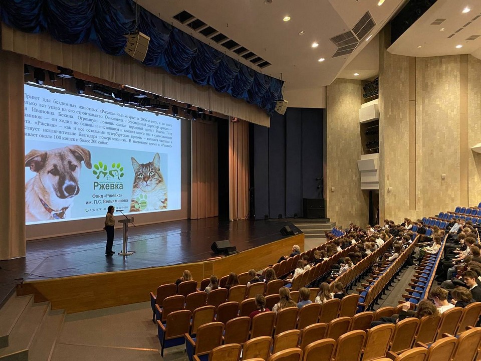 Анна Александровна рассказала ребятам о волонтёрской деятельности в приюте для животных «Ржевка», где на выезде школьники уже помогали в уходе за животными: кормили, играли и выгуливали.