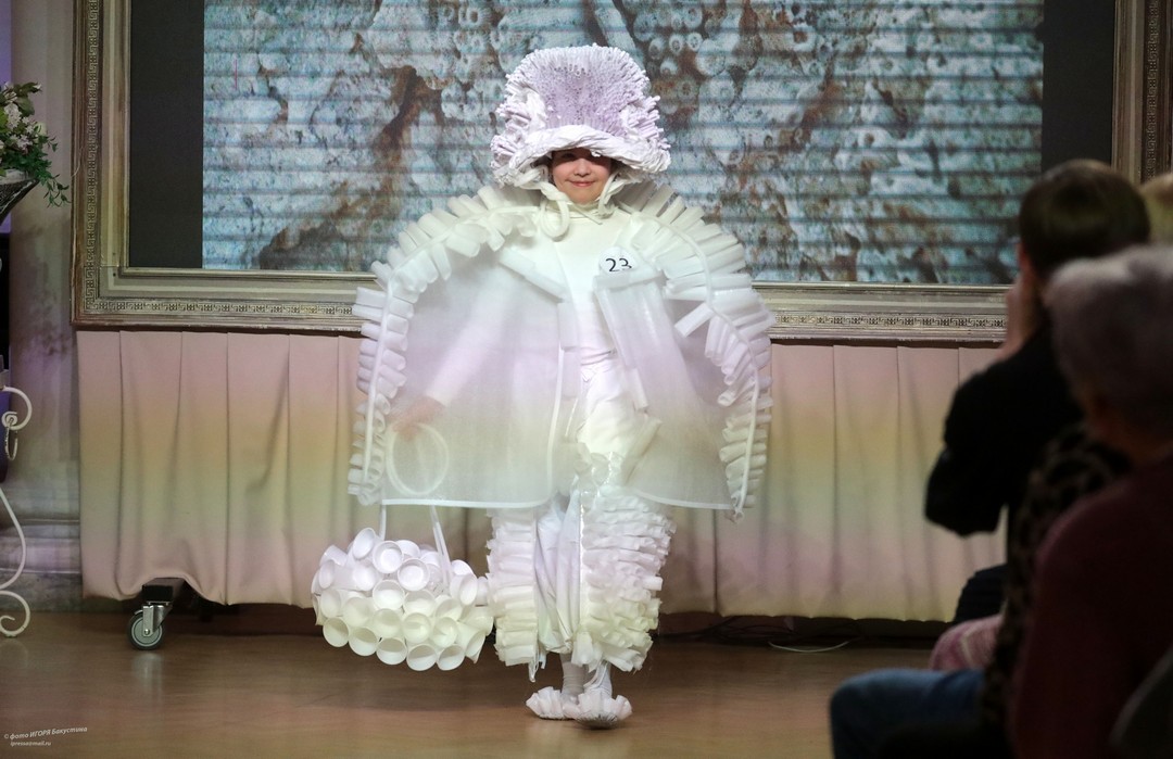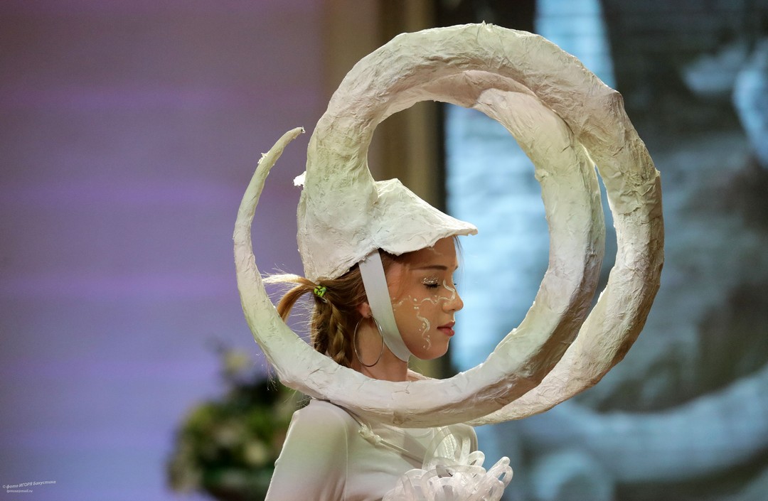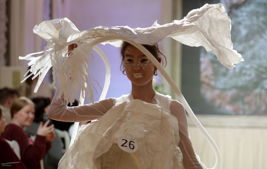 Невероятный полет фантазии увидели члены жюри и зрители. По условия конкурса работы должны быть выполнены с использованием нетрадиционных для создания одежды материалов, различных фактур и только белого цвета. Участники ответственно подошли к созданию своих моделей: использовали пленку в качестве юбки, строительные жгуты как кости древних животных, из бумаги делали голову динозавров и многое другое!